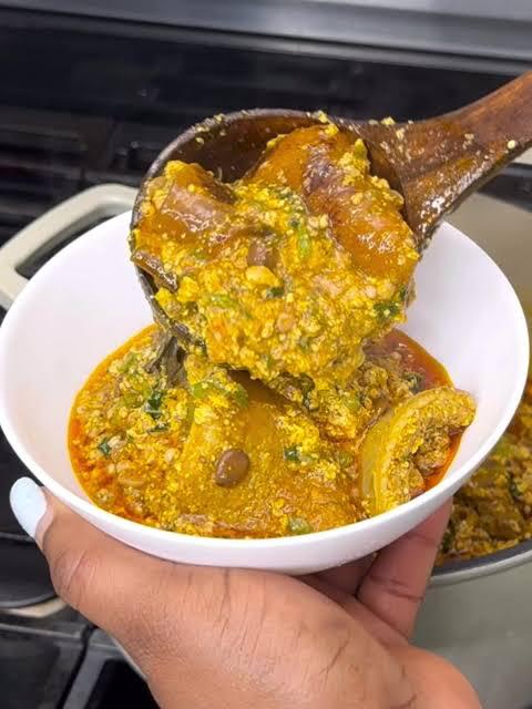 A bowl comes with freshly prepped Edikanikong ( vegetable)soup with assorted dry fish and periwinkle with fish/beef/ and protien
