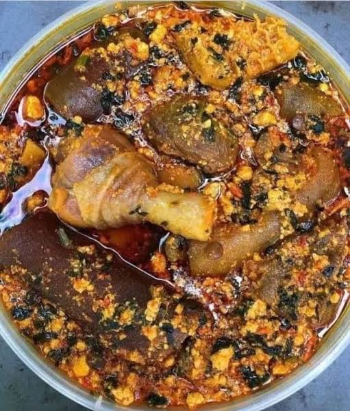 A plate comes with freshly prepped Egusi mixed with Vegetable soup with assorted dry fish and periwinkle with fish/beef/goat meat and swallow of choice