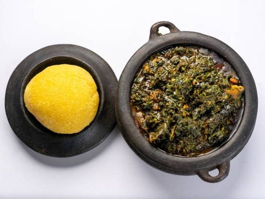 A plate comes with freshly prepped Vegetable soup with assorted dry fish and periwinkle with fish/beef/goat meat and swallow of choice