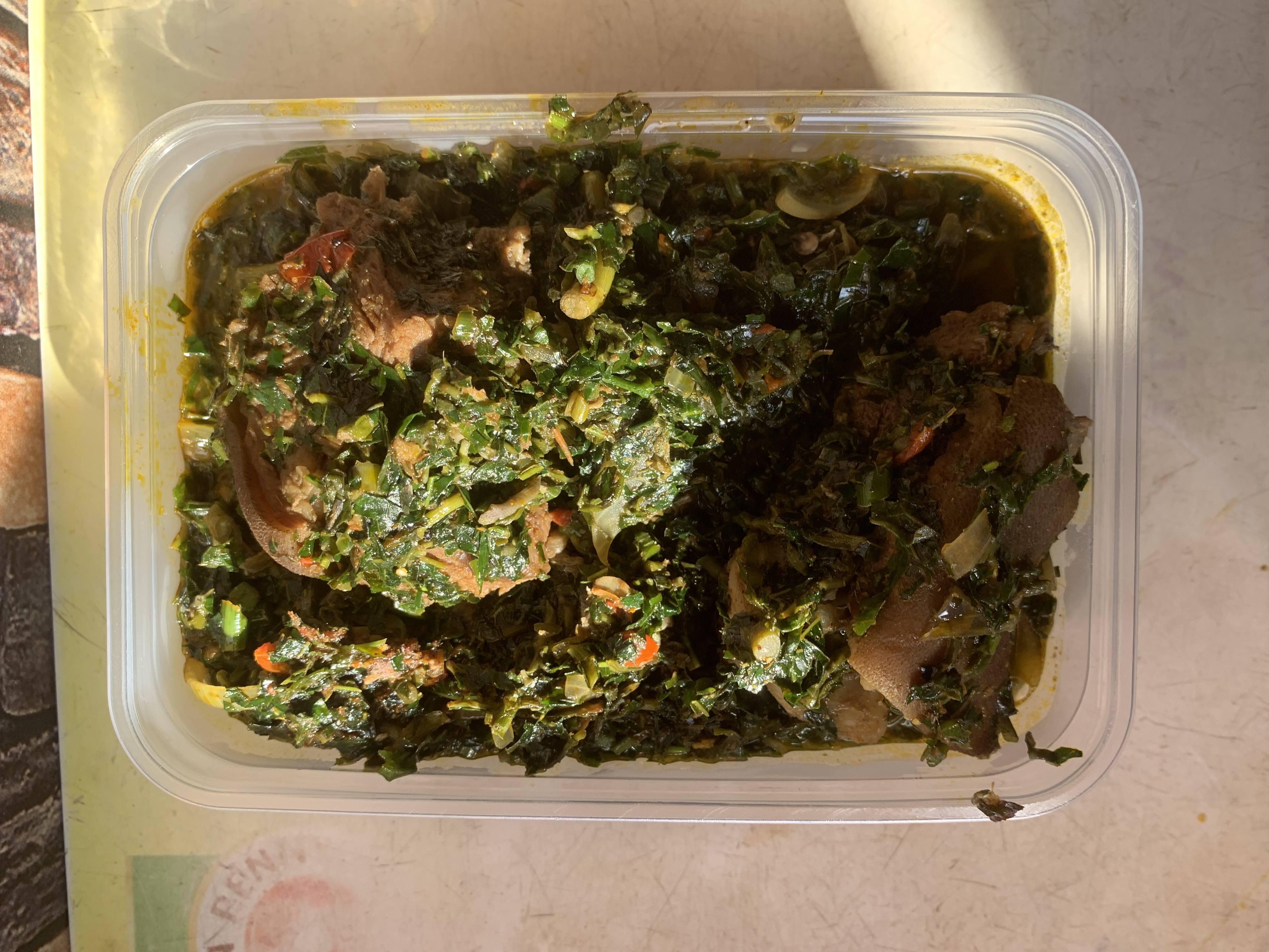 A plate comes with freshly prepped Afang soup with assorted dry fish and periwinkle with fish/beef/goat meat and swallow of choice