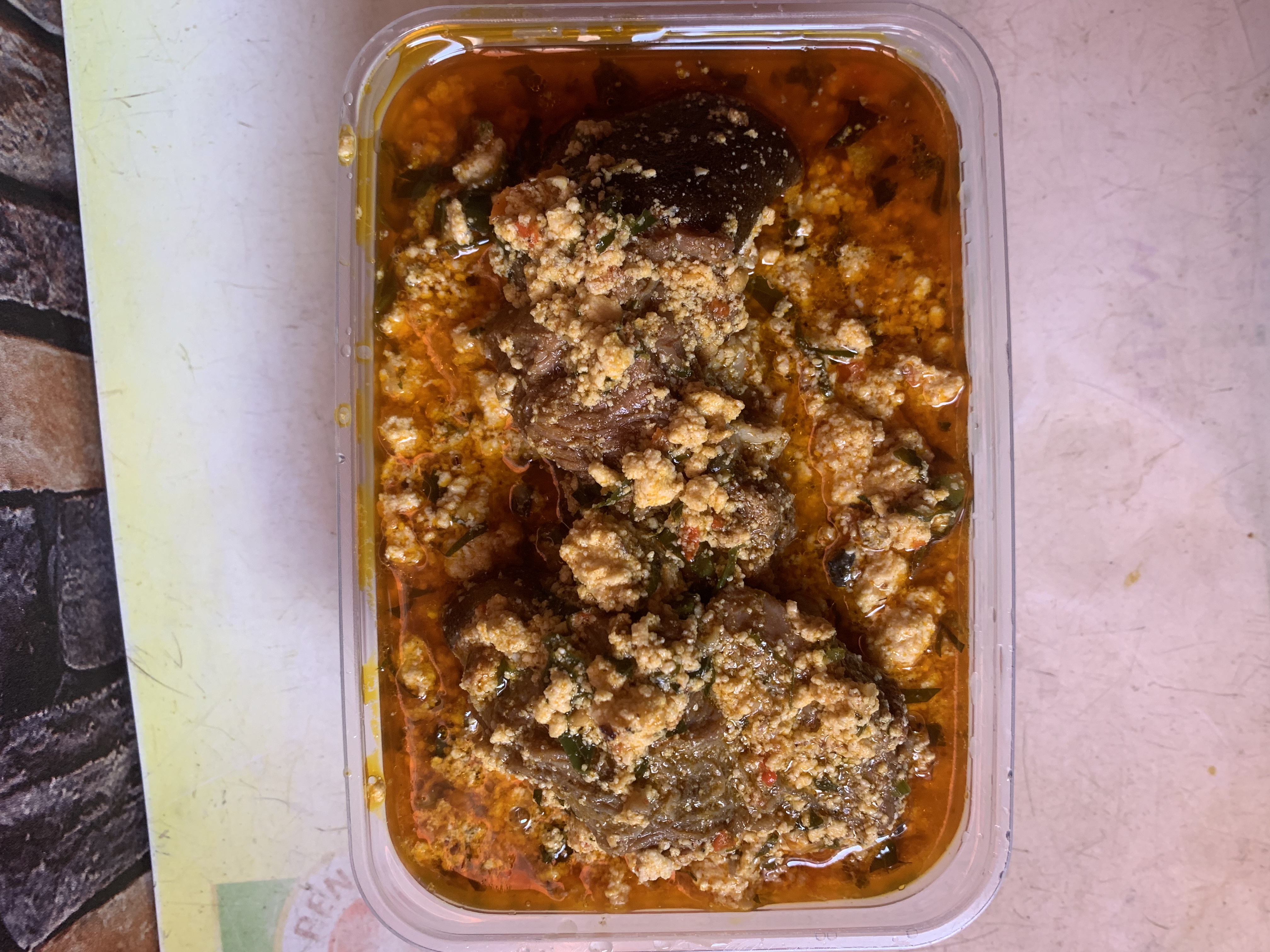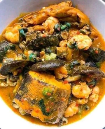 A bowl comes with freshly prepped Ogbono soup with assorted dry fish and periwinkle with fish/beef/goat meat