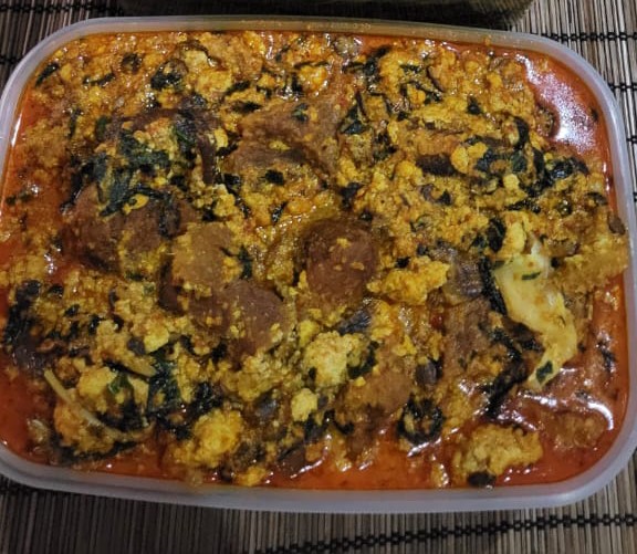 A plate comes with freshly prepped Egusi mixed with Vegetable soup with assorted dry fish and periwinkle with fish/beef/goat meat and swallow of choice
