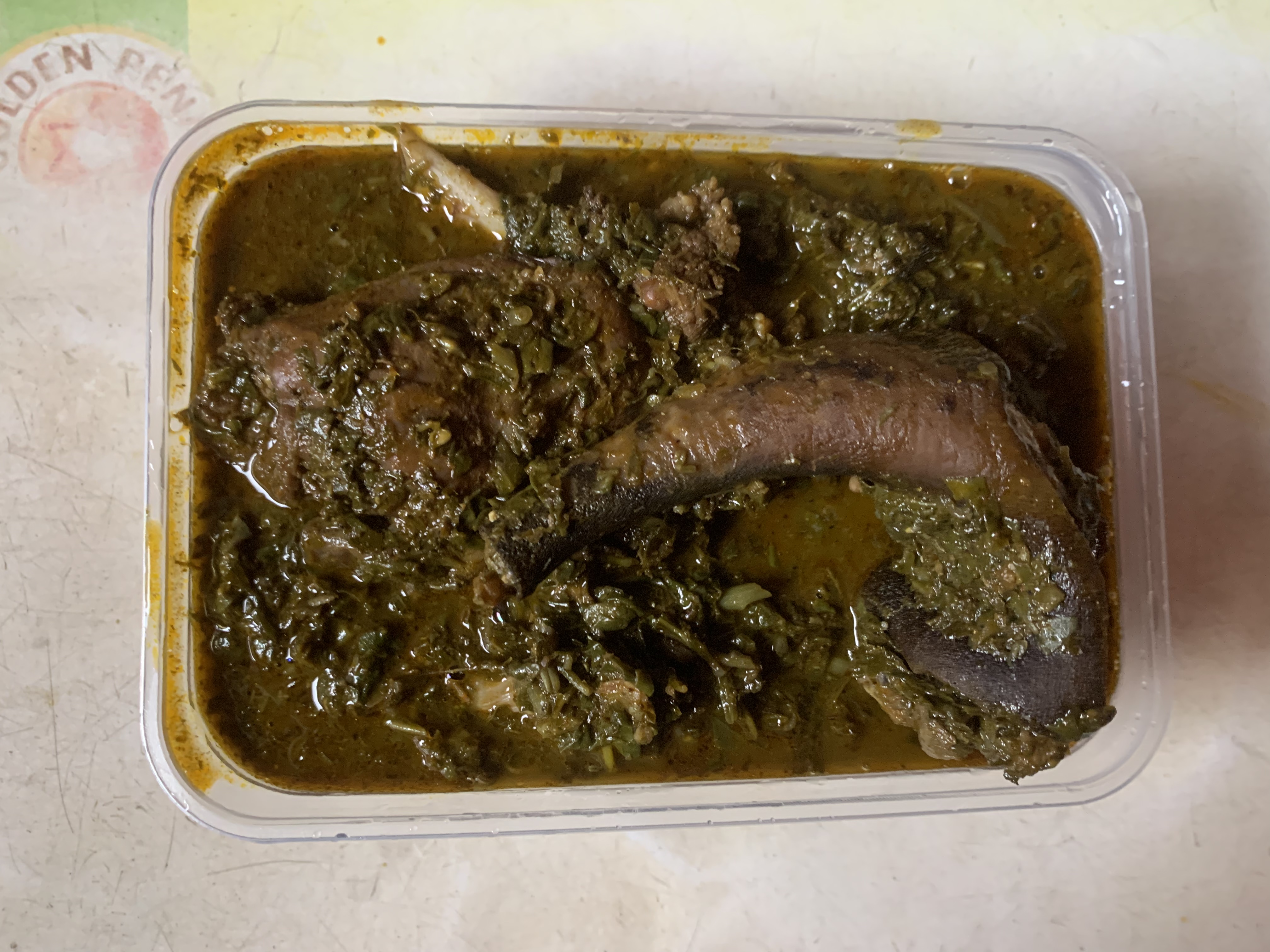 A plate comes with freshly prepped Atama soup with assorted dry fish and periwinkle with fish/beef/goat meat and swallow of choice
