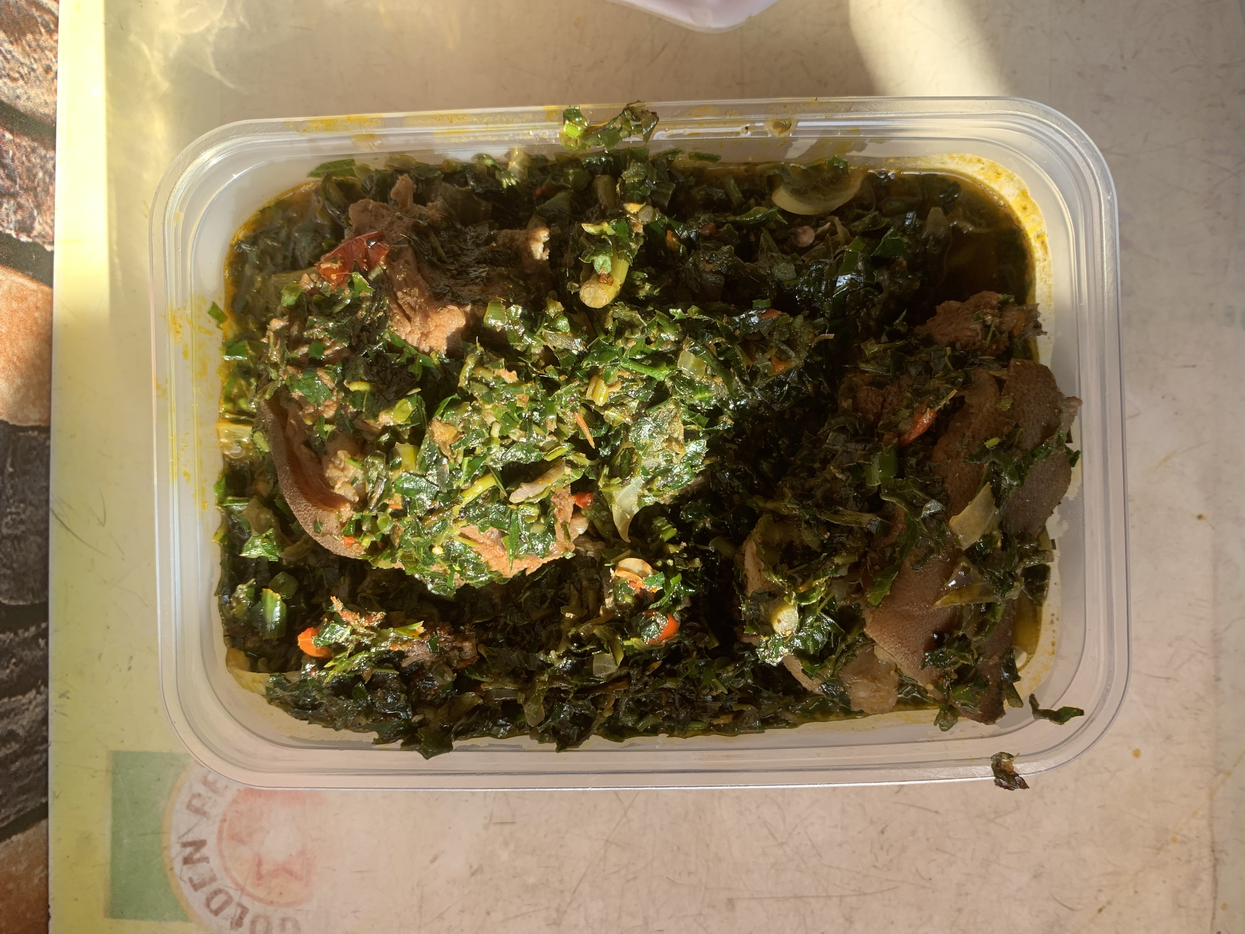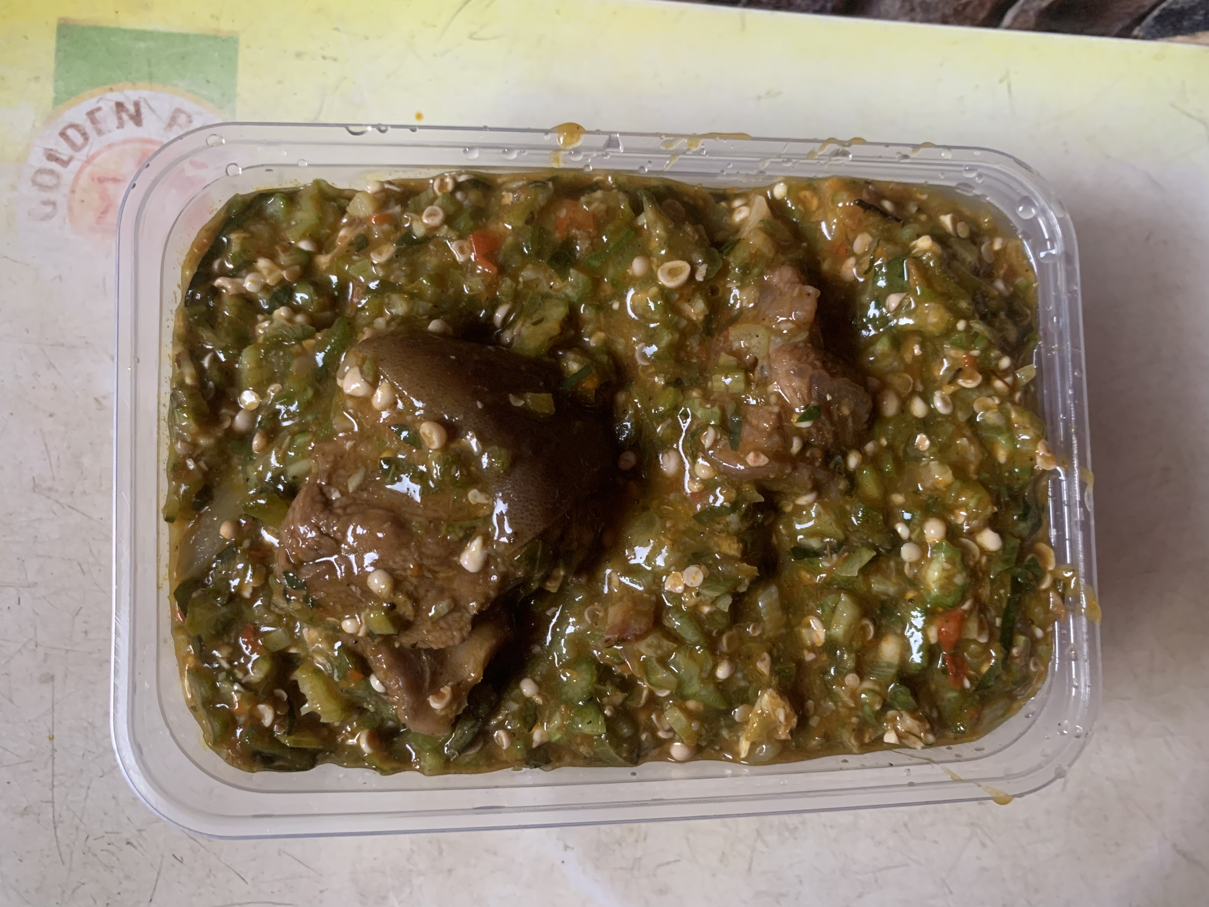 1 Plate of Egusi mixed with vegetable soup with 1 swallow and goat meat 2pc