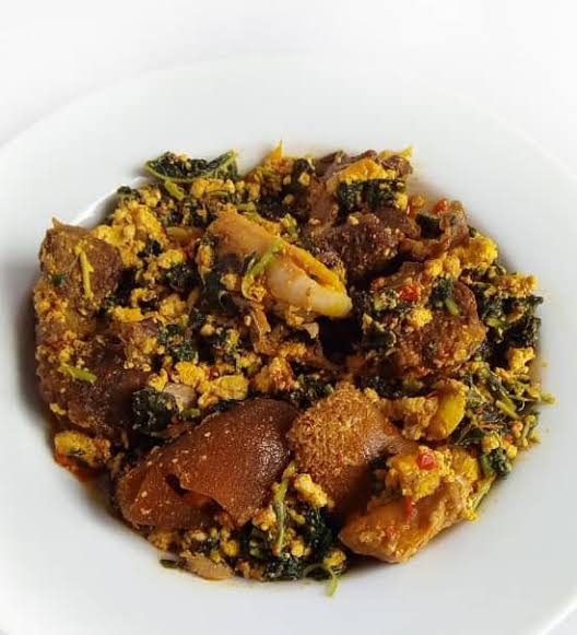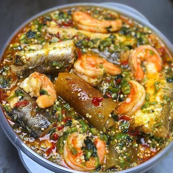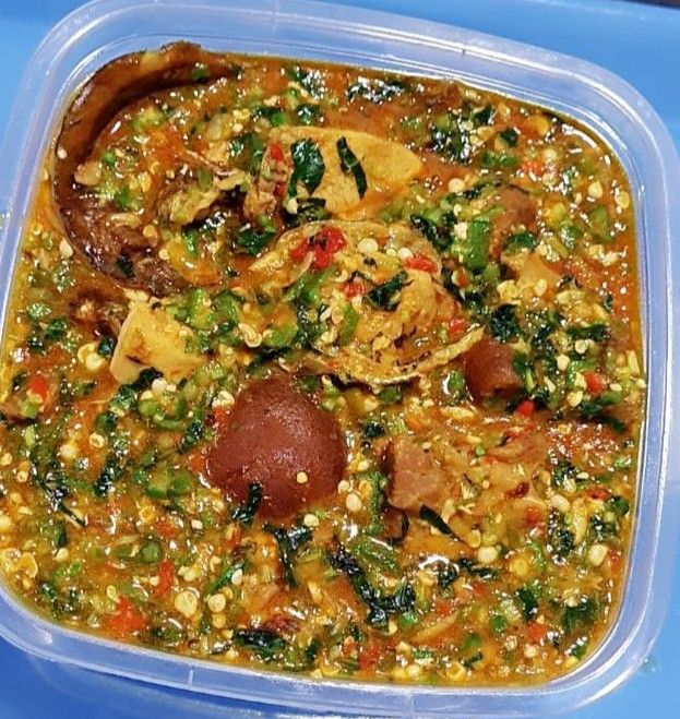 A plate comes with freshly prepared egusi mixed with okro soup with assorted dry fish